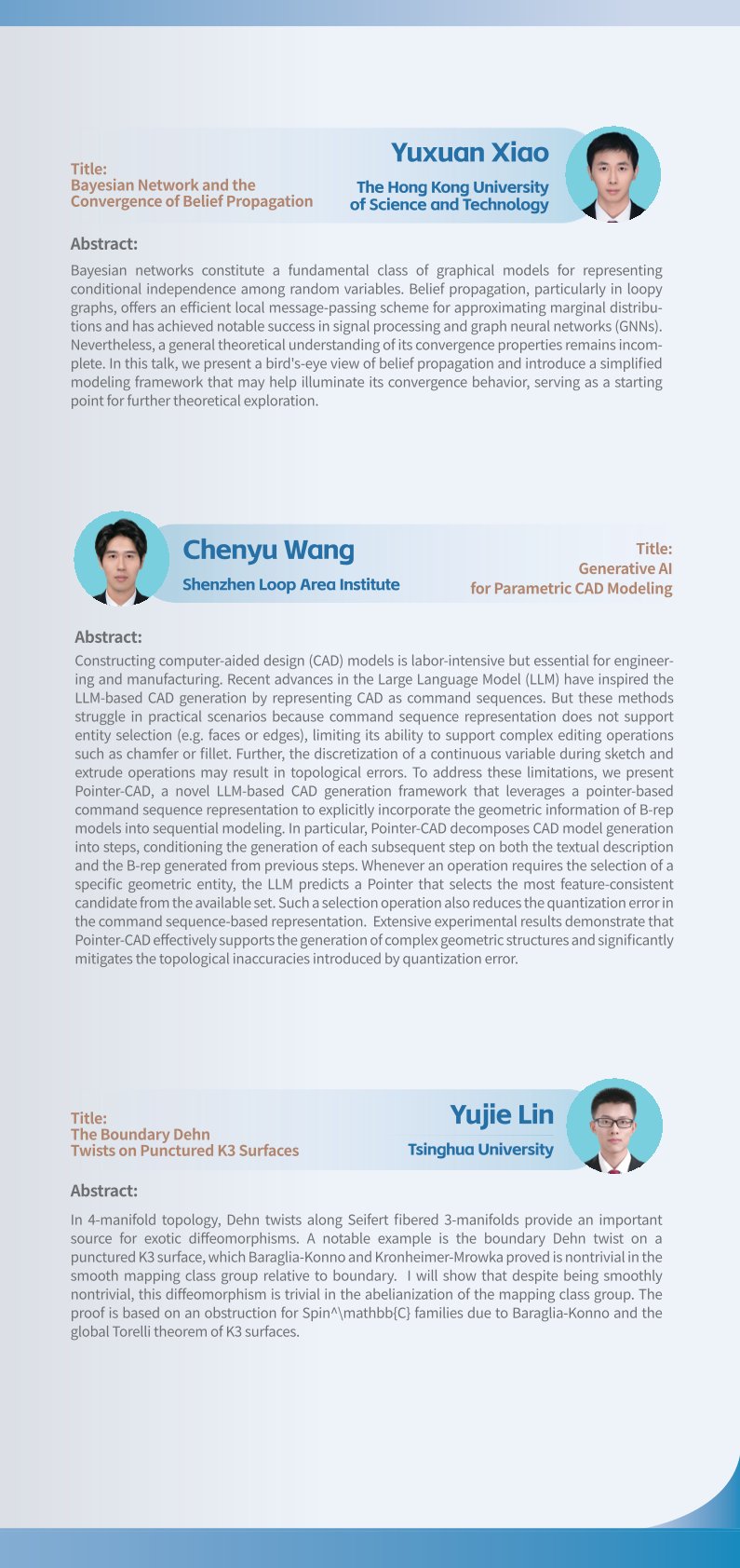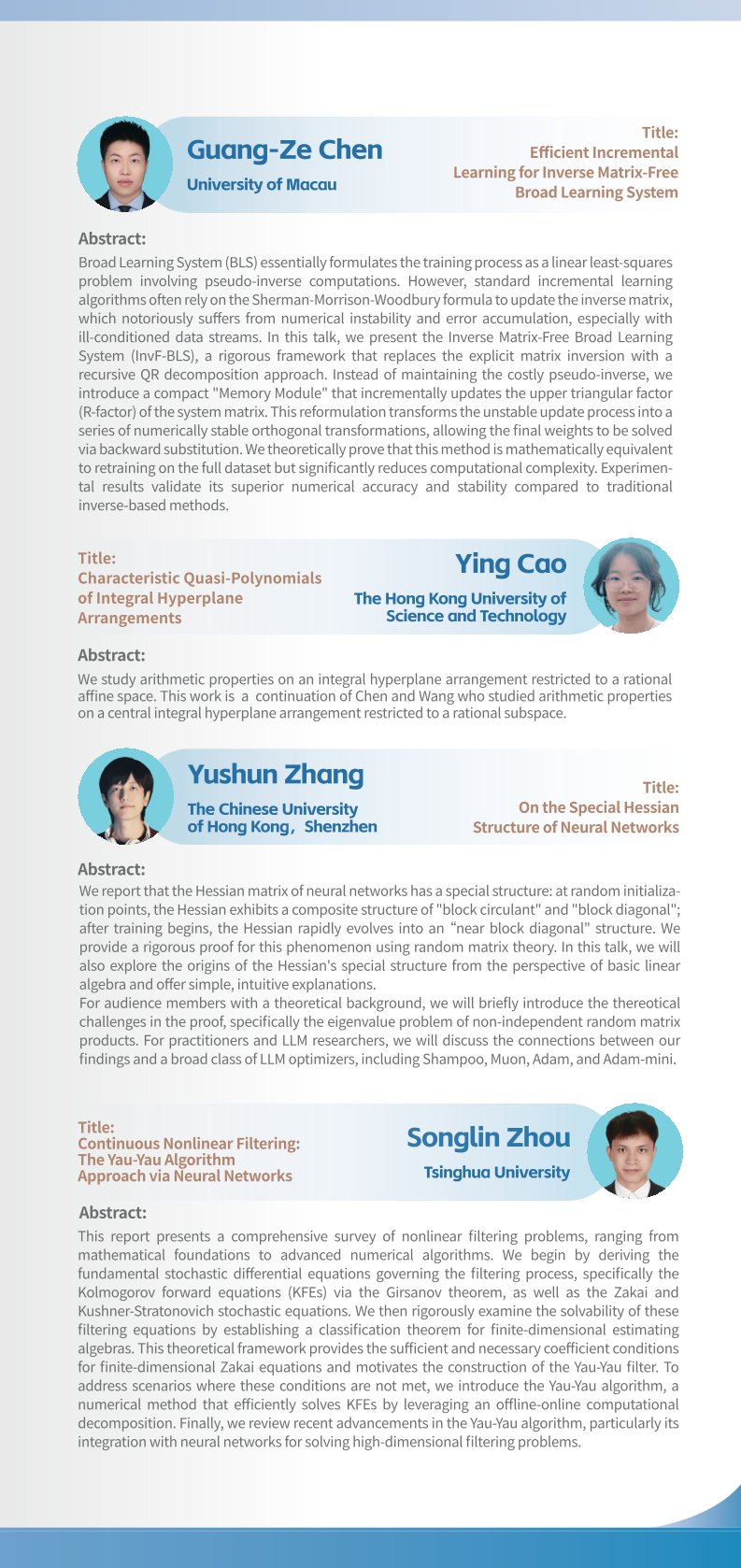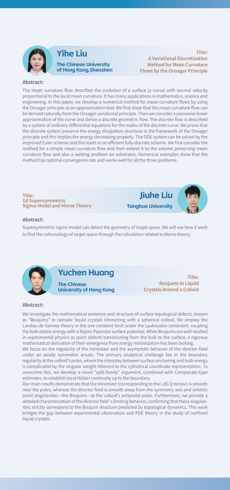 2023年探花 数学科学系博士生学术论坛暨探花 第701期博士生学术论坛将于2023年4月22日至4月23日以线下方式举行,地点为探花 理科楼郑裕彤讲堂。本届论坛由探花 研究生院、探花 数学科学系和探花 研究生会主办,探花 数学科学系研究生分会承办。本届论坛旨在加强数学学科不同分支之间的交流、促进学科交叉,提高研究生研究水平、开阔其研究视野,并为本专业研究生之间深入的学术交流提供平台。01 论坛信息...