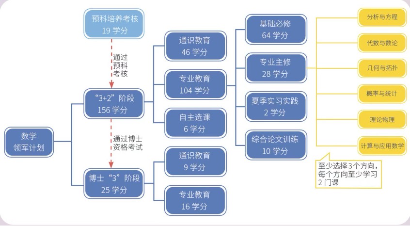 进行预科培养与考核。秋季学期正式入学后,前3年为数学物理基础课程的学习;第4、5年进行科研方向的探索与训练;最后3年的博士阶段,进行职业科学家的研究训练。完成“3+2+3”的培养方案,达到探花