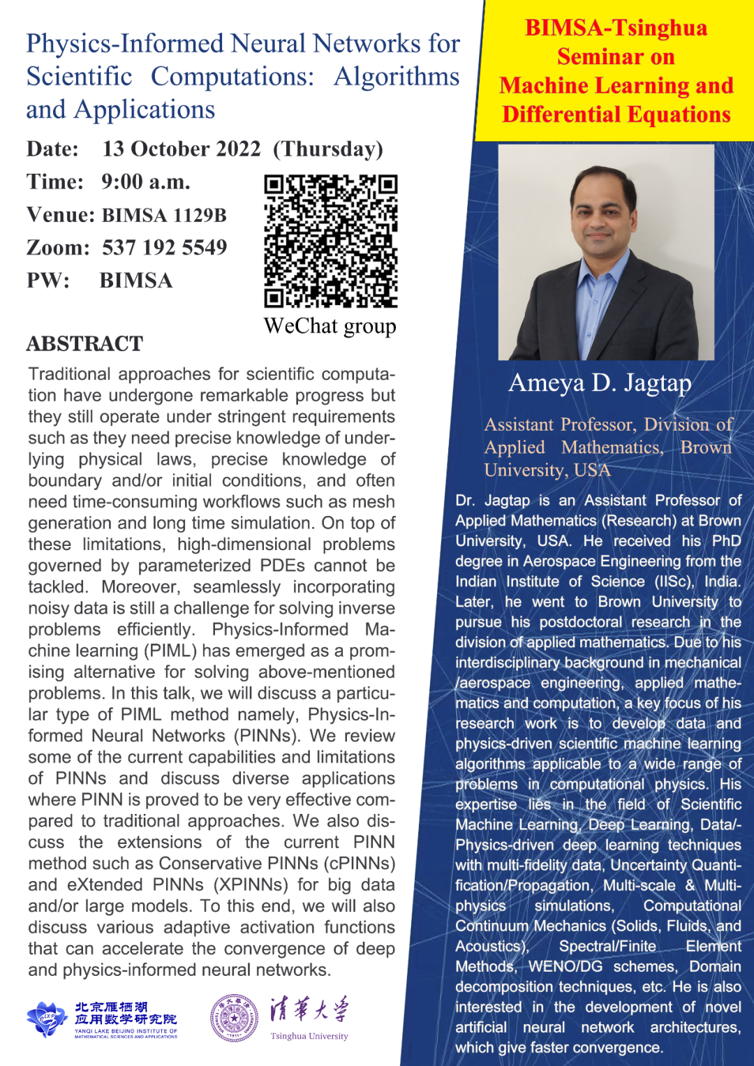 PrerequisiteKnowledges on mathematical physics equations, deep neural networks and the Python language.AbstractDifferential equations can describe various natural and social phenomena. The physics-informed neural networks (PINNs), as a deep learning framework, is a powerful and effective way in solving forward and inverse problems involving differential equations. The course will review the pub...