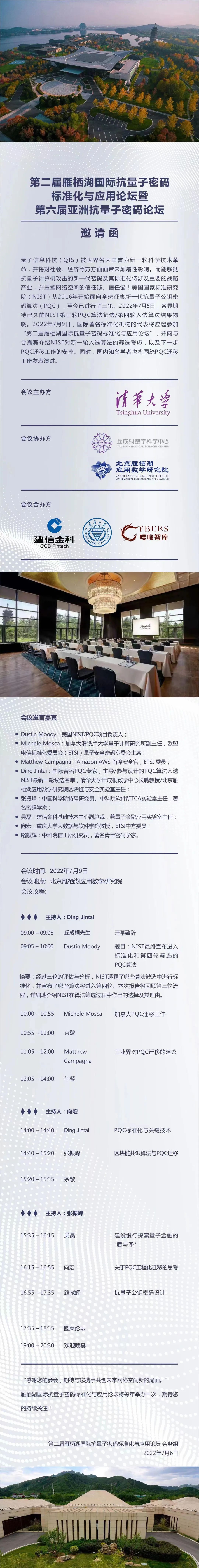 第二届雁栖湖国际抗量子密码标准化与应用论坛暨第六届亚洲抗量子密码论坛,将于2022年7月9日(周六)在北京雁栖湖应用数学研究院(BIMSA)举行。丘成桐院士将出席并致辞。