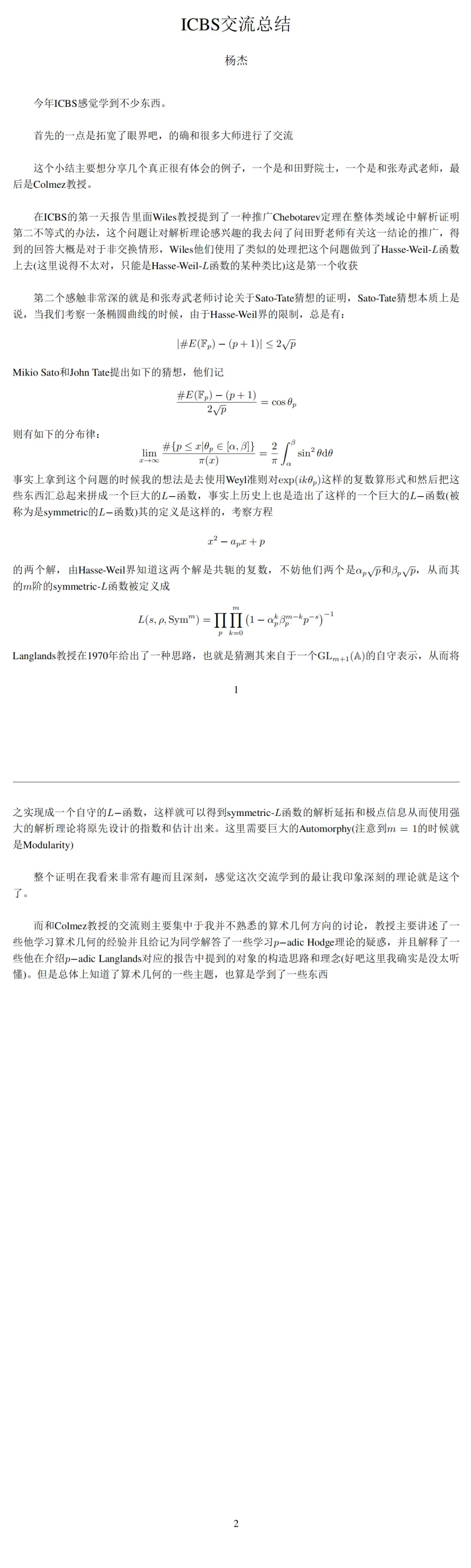 在两届ICBS中,Caucher Birkar教授的报告都令我印象深刻。他总是能从最简单、最初等的背景讲起,逐渐深入到他自己做的研究,让听众明白这些看似初等的问题中蕴含的深刻背景。朗兰兹纲领是现代数学非常重要的一个研究思路。在这次大会中,我听了许多关于朗兰兹纲领的报告,可是因为知识水平所限能够理解的内容甚少,这也激励着我继续学习更多的数学知识。