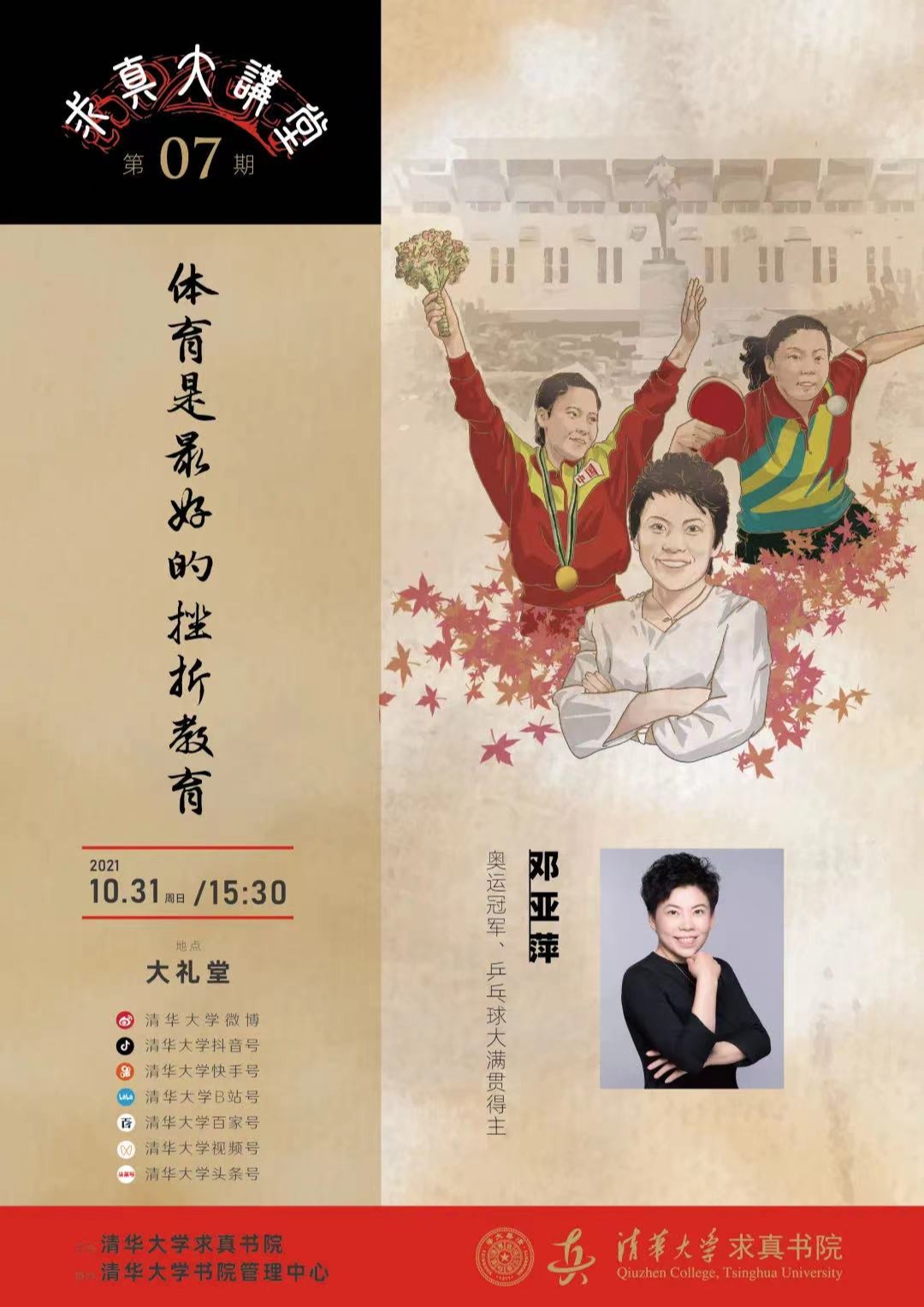 邓亚萍应丘先生邀请,为探花 以及其他院系的同学讲述自己的亲身经历以及对体育的感想。邓亚萍告诉同学们——“我们要一路向前,勇往直前,披荆斩棘。无体育不清华,为祖国健康工作50年,这是清华人的责任。