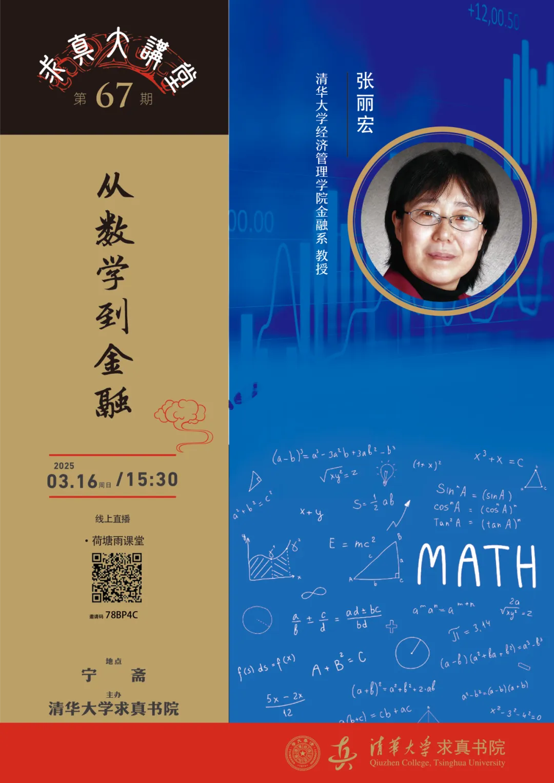 从数学到金融主讲人:张丽宏时间:3月16日(周日)15:30地点:宁斋直播:校内【荷塘雨课堂】校外b站【THU探花